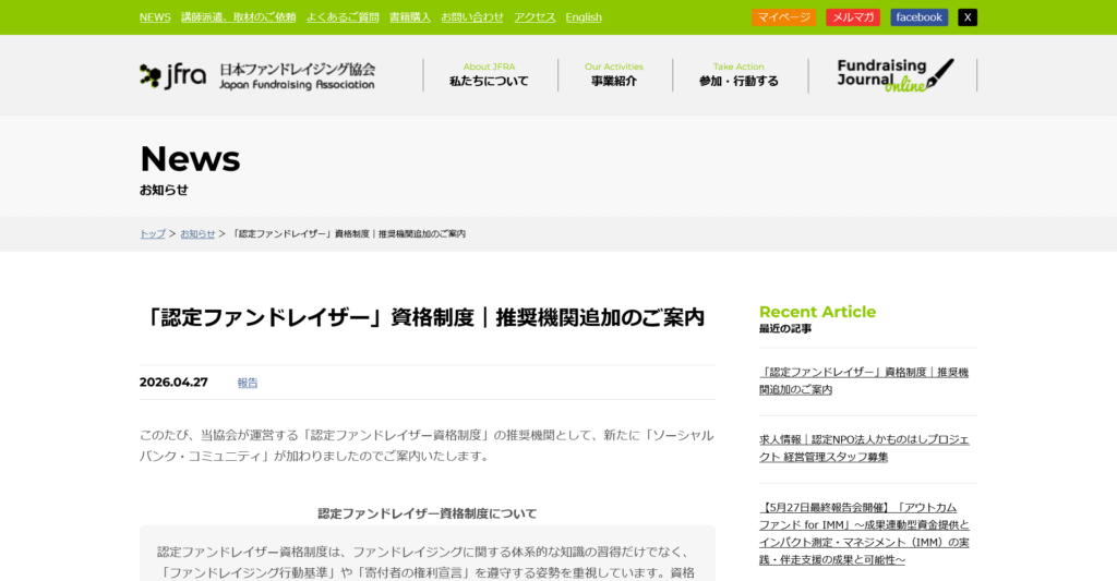 • 認定NPO法人日本ファンドレイジング協会「認定ファンドレイザー資格制度」の推奨機関になりました